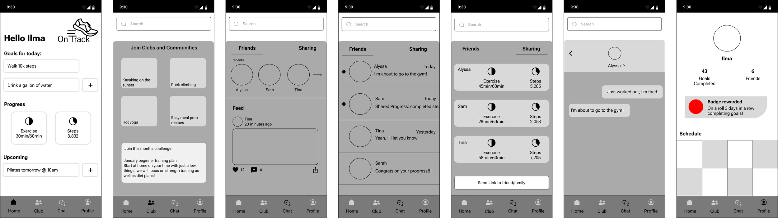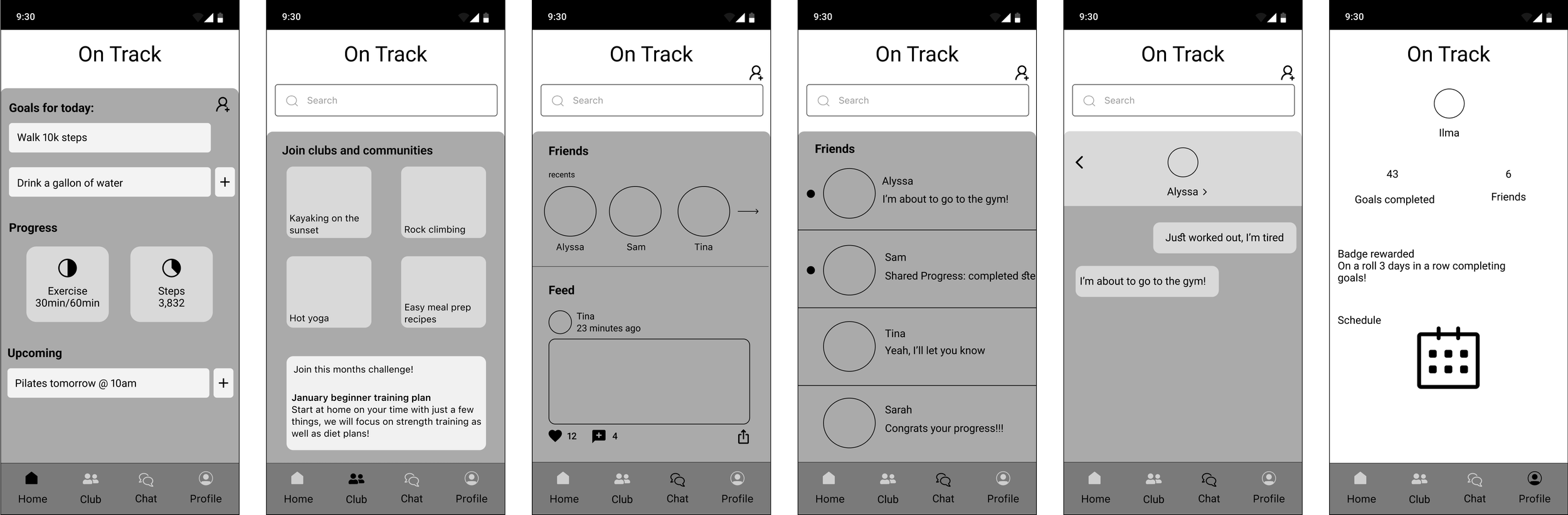 Instead of the friends/sharing tab, I created a top 3 leaderboard on the home screen. This also takes place of constant notifications when others achieve a goal. Now users are able to see who their competition is and use this as motivation! Additionally, I found a different way to present progress in the profile page. This visual suited the look of OnTrack and was easy to read and understand.