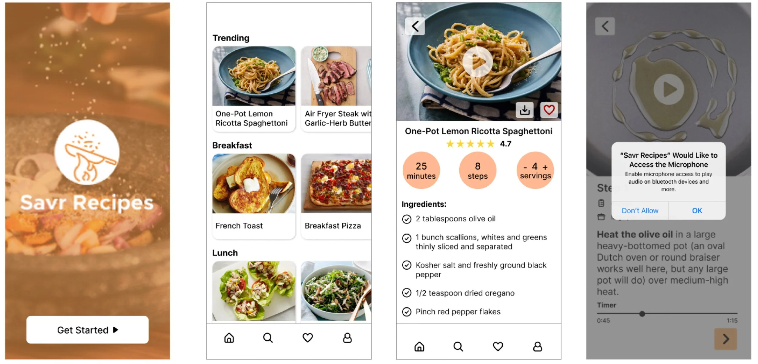 1) select a recipe 2) review it by scrolling 3) clicking the step-by-step button 4) prompted to allow access to the microphone 5) show the voice commands