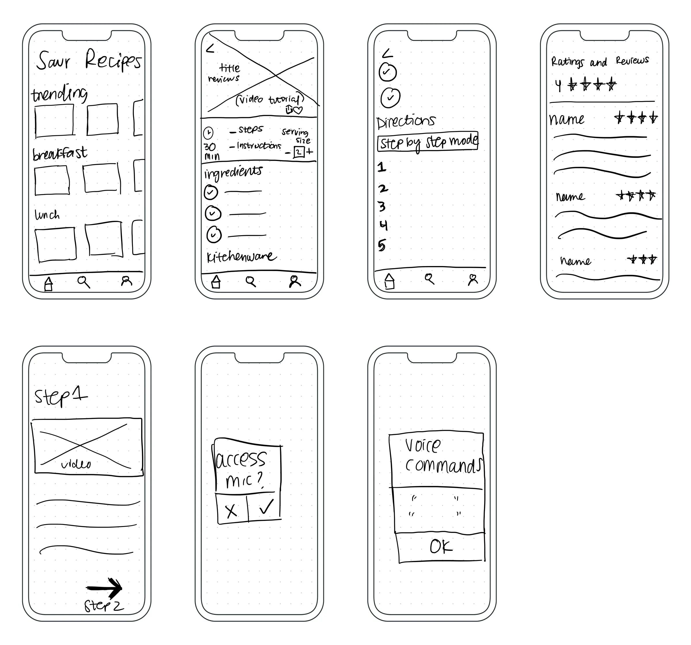 Originally, the mic access and voice command messages came up when you click the recipe on the home page, but 2/5 users suggested the popup screens for the mic and commands to show up when you click the step-by-step mode.